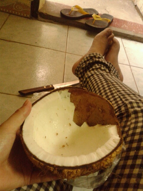 2015/05/01 Category : カンボジア生活 カンボジアのココナッツオイル 以前、信号待ちで止まっていた時のこと。泣き声が聞こえて、ふと声の方を見てみたら、泣いてる赤ちゃんをおばちゃんが抱っこしてあやしてて、「うーっぷ!うーっぷ!」って言いながらちゅっちゅしてんのね。一方赤ちゃんは見るからにキスが嫌みたいで、さっきよりも激しく泣き始めた。するとおばちゃんはさらに「うぅーっぷ!ううぅーぷ!」って言いながらもうキスというか顔食う勢いで赤ちゃんに………とりあえずそのうーっぷ!とキスをやめたげなよと思いながら私は青信号を進んだのでした。スオスダイ。さー、8時に寝たせいでこんな時間に目が覚めたよおはよう世界。二度寝すれば良かったんだけどなんかスイッチ入ってしまって目がさえちゃった。あー眠れん、ってことでこないだ買ったココナッツについて書こうと思います。日本ではすごい人気らしいね、ココナッツオイル。それがこれか?ってやつがあったので買ってみた。この白い果肉ところがそれっぽいぞ!お値段3500リエル(90円位?)でした。しかしこれ、食べ方が分かんないんだわwww家に帰ってから「ハッ!どうやって食べるんじゃろう?」って気づいたのである。。仕方がないから果物ナイフでくり抜いて食べることにww超肉厚です。歯ごたえはかなりあります。鳥の軟骨並の硬さ。ぼりんぼりんって感じ。4分の1も食べきらぬうち、なんと満腹。やっぱオイルだからかね!でもってその数日は肌がツルテカな感じした!美容にマジいいねこれ!しかもですな全部食べ終えたのがこちら。ココナッツの殻です。なんと内側がつるつる、すべすべ。果肉がそこにあったとは思えないほどさっぱりしてるのです。中ににんにく、生姜を入れたらあら素敵!立派な小物入れに!wwwしかし外側がぼろぼろやからヤスリで磨いてあげないとね。ちなみに日本にあるココナッツオイルがどんな物なんかは分かりませんが!wカンボジアでは天然のココナッツオイルが安いし旨いです!でもって食後は殻が小物入れにもなります!www肌が荒れ気味の時はまた食べよーっと( ゚∀゚ )例えばこんな時間に携帯電話を見つめてる翌日なんかはだな………w [0回]PR Comment0 Comment Comment Form お名前name タイトルtitle メールアドレスmail address URLurl コメントcomment パスワードpassword