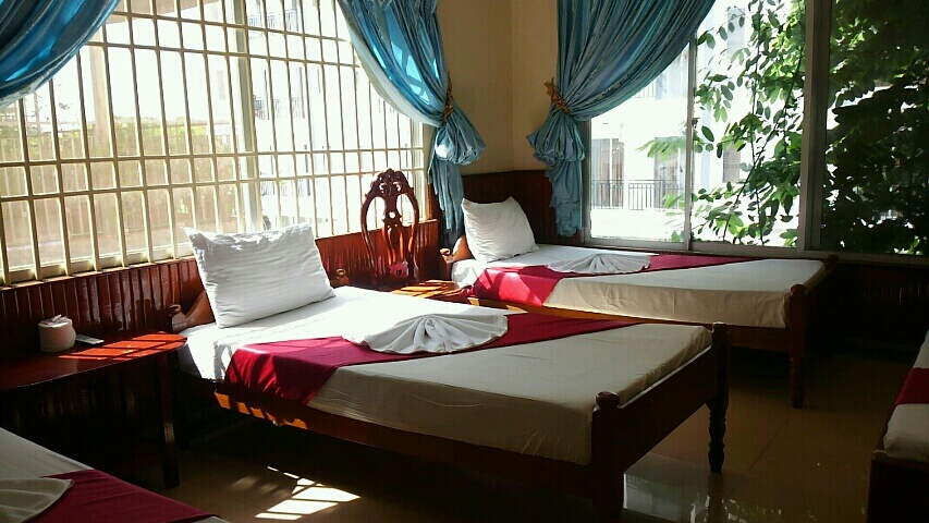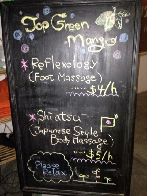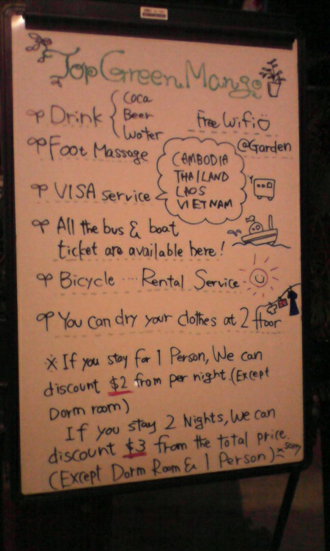 2014/05/14 Category : ゲストハウス学 Top Green Mango! 顔から火が出るほど恥ずかしいってああいうのを言うのだろうなぁ、と体験しちゃった金島です。寝る場所は選ぶべきです、あはーん(^ρ^)さてさて!だいぶ日が経ちましたが、私が今働いているゲストハウスの紹介をします!ばばーん ぬ!改めまして、現在カンボジアのプノンペンにあります、"Top Green Mango"というゲストハウスに住み込んで働いています。掃除から接客やら全てが楽しいでやんす!それからポルトガル、オーストリア、フランス、カナダ、パレスチナ…いろんな国からお客様が来られます!もちろん日本人のお客様もおられます。その時は旅の話や、大音声の口笛の吹き方を教えてもらったりなどいろんなお話を聞かせてもらいます。しいて今の生活で悩み事があるとすれば、朝昼晩のまかないのご飯が美味しすぎて白ご飯のおかわりを3杯くらいしちゃう事です。お料理上手で愛嬌いっぱいスタッフのMr.ワンタンです。彼の料理がたまらないのです。(ちなみに今夜のご飯のおかずはアリでした。その話はまた後日w)最近は『もっと食べろ』と言って、皆が私のお皿にもりもりご飯をよそってくれるようになりました。フレンドリーで優しいスタッフさんばかりの素敵な所です(^^)b そして内装はむーちゃくちゃきれいです。そして静かです。白い壁、緑のドア、淡いオレンジの光りなどなど、ひたすら落ち着きます。それから建物と建物の間のスペースにはお庭があります。そこのチェアーに座って、切り取られたみたいな空に浮かぶ昼間の月を見るのが好きです。ベッドはこんな感じ。枕もマットレスもふっかふっかすぎて思わずばいんばいんしたくなる!凄く寝心地の良いベッドです。ここが1番好きなスペース。ちょっと暗くて見えにくいですが、スパやマッサージをする所です。ここでそっくり返ったら気持ち良いのですわ〜(*´ω`*)そこで描かせてもろたマッサージの宣伝ブラックボード。ゲストハウスのウェルカムボード。まだまだいろいろ描かせてもらえそうなので、すーごい楽しみです(^ρ^)もっと想像力鍛えないとなっと!ちなみにお部屋は設備や値段にバリエーションを持たせて設定しておりますので、あなたにあったお部屋がきっと見つかるはずです。カンボジアまで来られる際にはぜひくつろぎにきてくださいまし〜\(^o^)/Te l : +855 -(0)97 412 7722add : ♯42, St.23, Village 8, Sangkat Chey Chumneah, Khan Daun Penh, PNH, Cambodia 12206顎打(Agoda)(^ω^)武器愚怒涛込(Booking.com)(^ω^)旅行助言者(tripAdvisor)(^ω^) [0回]
